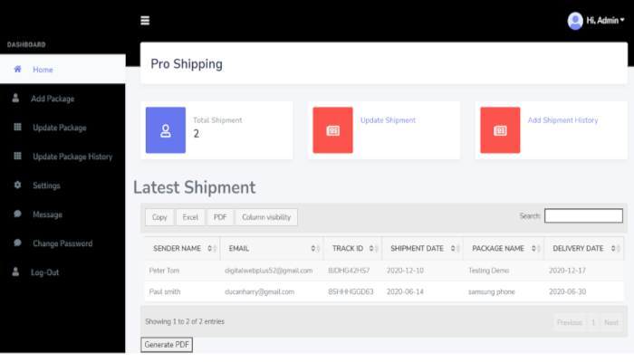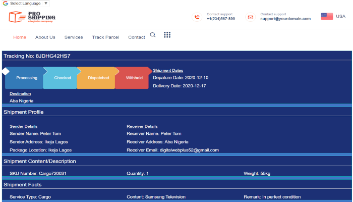 For a courier script to be standard it should have a progress bar that shows the shipping progress. This we added into consideration while developing this courier script. It has a different level of progress the is controlled by the admin, the status includes: processing, checked, departure, completed, and withheld.
